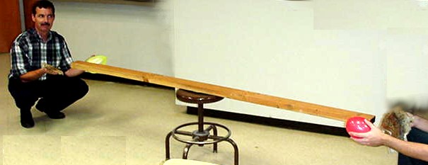 1. Balance a long 2"x4" board on a watch glass that has been placed on a stool