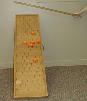 Wooden balls are rolled down a ramp with nails. The slope of the incline can represent the